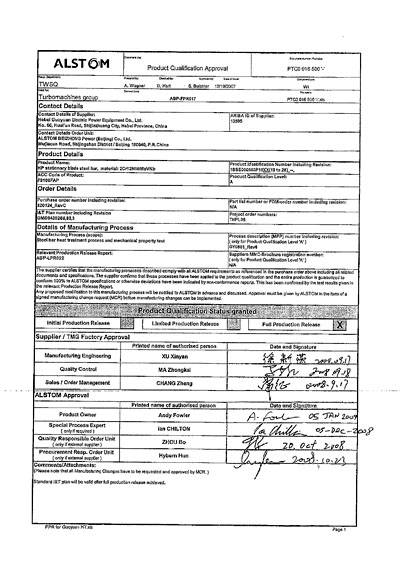 2008年我公司為ALSTOM提供的葉片通過了FPR(完全放行文件)、并且成為國內(nèi)唯一一家ALSTOM授予FPR的產(chǎn)品供應商。